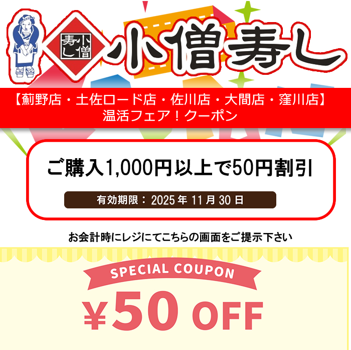 小僧寿し【薊野店・土佐ロード店・佐川店 ・大間店・窪川店】温活フェアクーポン!