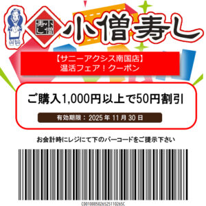 小僧寿し【サニーアクシス南国店】温活フェアクーポン!